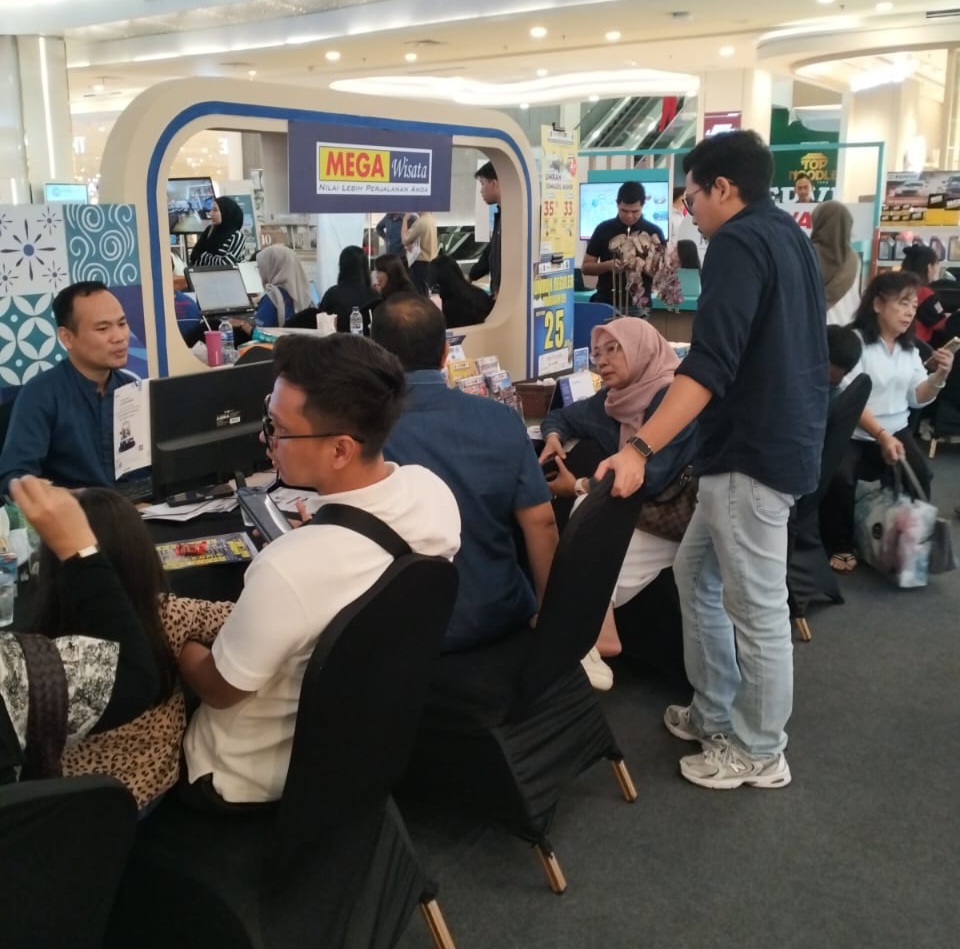 Salah satu booth yang ramai diserbu pengunjung adalah milik Mega Wisata, yang hadir dengan berbagai program promo menarik.