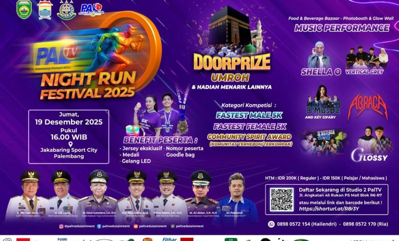 MyMegawisata.com, Palembang — Ajang olahraga dan hiburan bergengsi PALTV Night Run Festival 2025 siap menyemarakkan akhir tahun masyarakat Palembang.