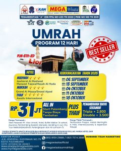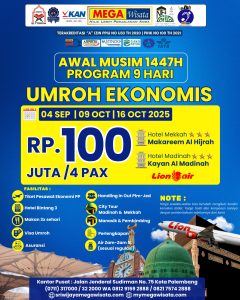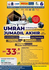 MyMegawisata.com, PALEMBANG — Kabar gembira bagi umat Muslim yang merindukan Tanah Suci! Mega Wisata Tour & Travel kembali menghadirkan program unggulan Umrah 12 Hari, yang menjadi Best Seller karena fasilitas lengkap, harga terjangkau, dan berangkat langsung dari Palembang tanpa biaya tambahan.