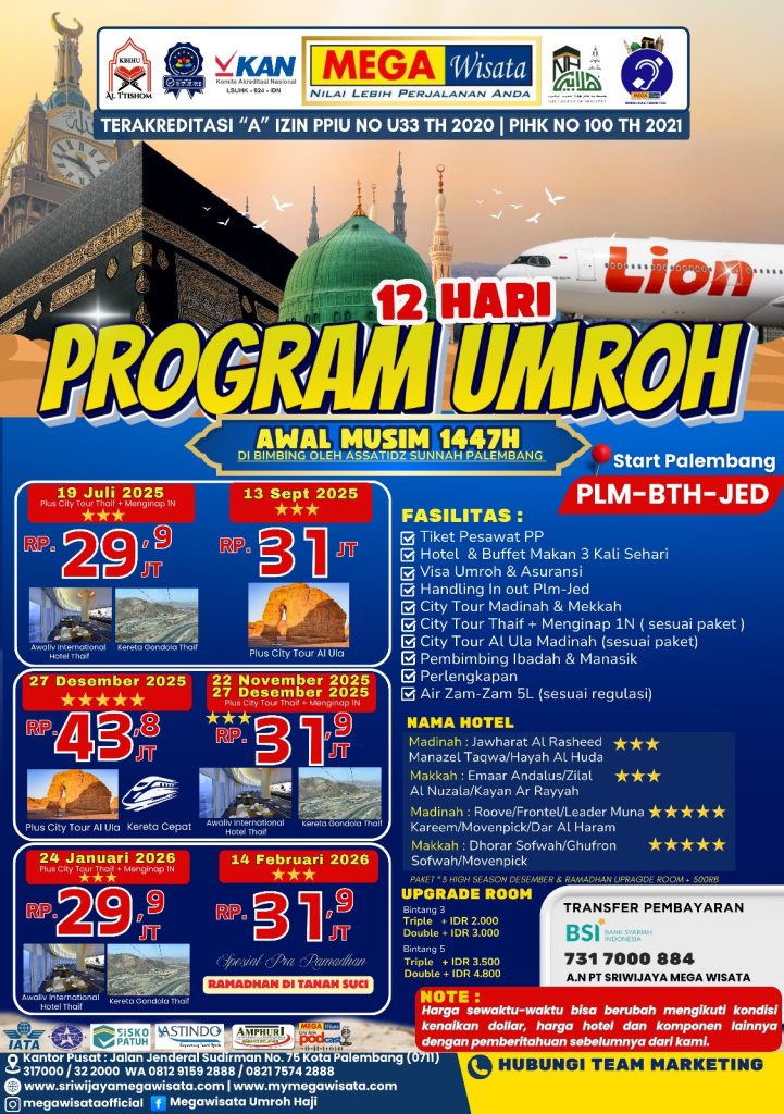 Semoga seluruh jamaah Mega Wisata yang akan berangkat 14 Agustus 2025 mendatang, diberikan kelancaran, kekuatan, dan keikhlasan, serta kembali ke tanah air dalam keadaan umrah yang mabrur, hati yang bersih, dan jiwa yang terangkat.