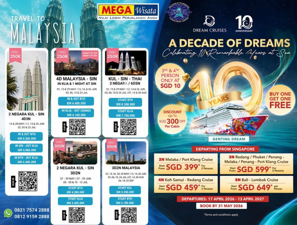 Selain itu, tersedia pula promo spesial untuk perjalanan kapal pesiar (*Dream Cruise*) rute Malaka/Port Klang selama dua malam dengan skema *buy one get one free*. Penawaran ini membuka peluang bagi masyarakat untuk merasakan pengalaman wisata bahari internasional dengan harga yang lebih terjangkau.