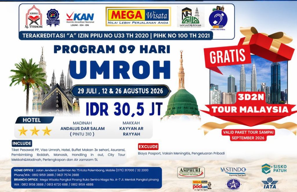 Baca Juga  Mega Wisata Luncurkan Paket Umrah Mabrur 12 Hari, Berangkat 7 Februari 2026