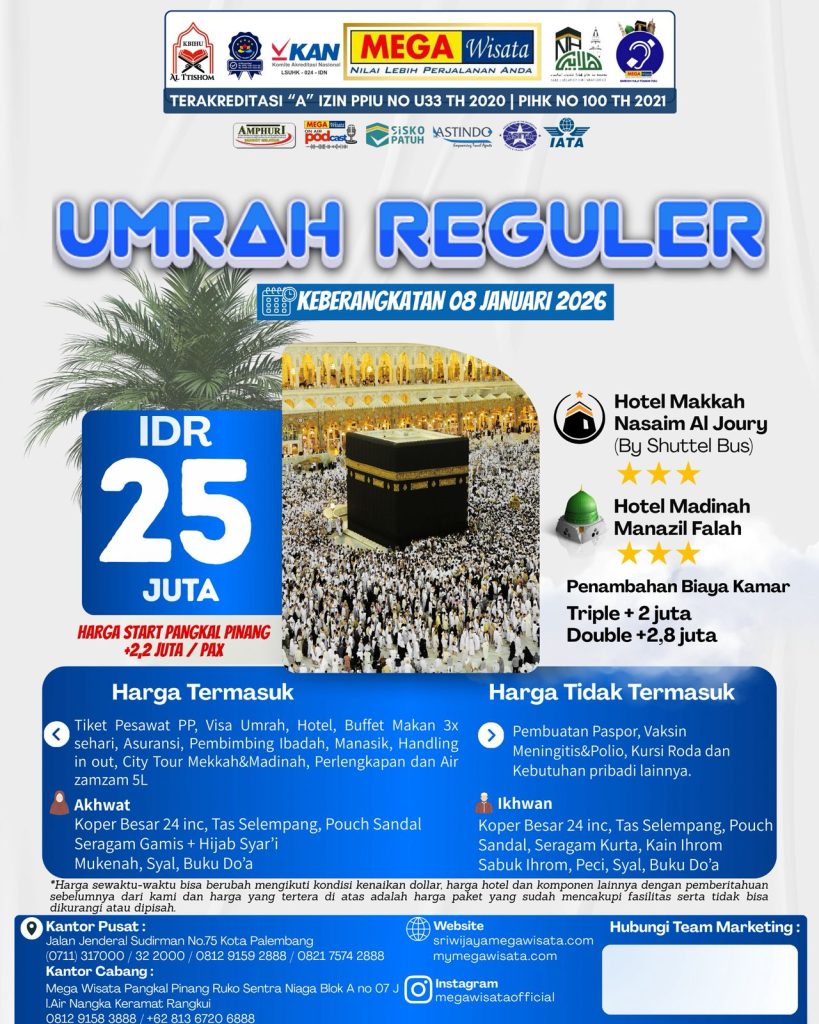 Pendaftaran Program Umroh Februari 2026 telah dibuka dan dapat dilakukan melalui kantor pusat Mega Wisata di Palembang maupun perwakilan resmi di berbagai daerah.