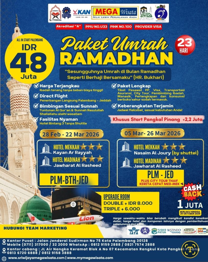 Program ini akan berangkat 25 Desember 2025 langsung dari Palembang (Direct PLM–JED) menggunakan maskapai Lion Air, selama 9 hari penuh kenangan ibadah yang tak terlupakan. Dengan harga Rp 35,8 juta (Quad), jamaah akan mendapatkan fasilitas hotel berbintang dan pelayanan terbaik di kelasnya.